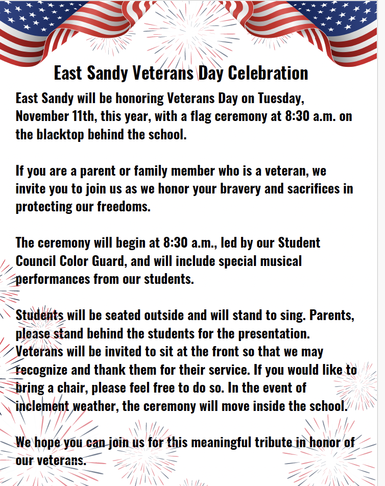 East Sandy will be honoring Veterans Day on Tuesday, November 11th, this year, with a flag ceremony at 8:30 a.m. on the blacktop behind the school.