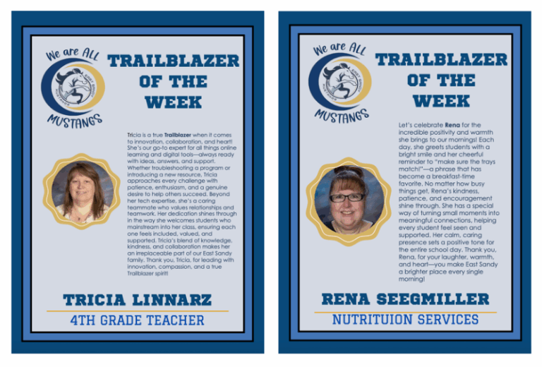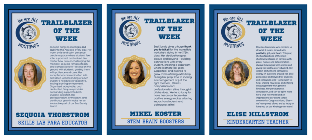 🌟 Trailblazer Spotlight 🌟Our faculty and staff are truly incredible! Every day, our teachers and staff members go above and beyond to support our students at East Sandy. We are so grateful for their dedication, enthusiasm, and commitment to helping our Mustangs shine.
