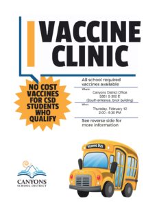 CSD Sponsored Vaccine Clinic, Feb. 12 – Canyons School District’s Nursing Department is making it easier to cross “vaccines” off your busy to-do list. The District is sponsoring a vaccine clinic, Thursday, Feb. 12, 2-5:30 p.m. at the Canyons District Offices, 9361 S. 300 East in Sandy (park and enter on the south side). CSD’s clinic accepts health insurance, and participants who have active coverage will be billed. Families with a health plan are asked to confirm vaccine coverage prior to attending. Qualifying students who don’t have health insurance can receive school-required vaccines at no cost. See details below