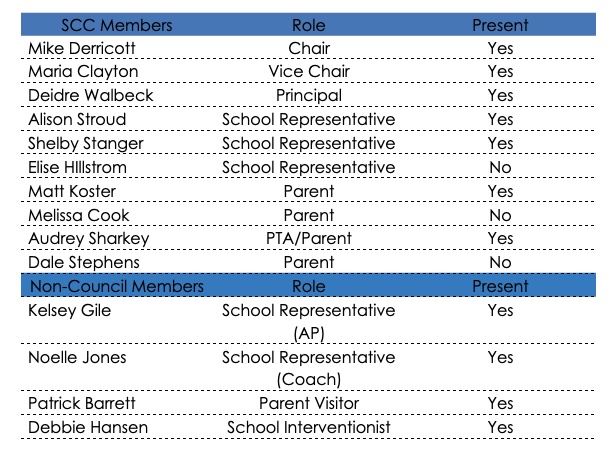 Digital Citizenship discussion occurred in November. Deidre displayed the district website for safety plans. The SCC last year identified transportation safety as the focus area. Feedback from the SCC was that the website was appropriate and informative. The daycare buses have been directed to drop off and pick up in the northeast corner of the parking lot. This change allows students to use sidewalks to get inside of the building.